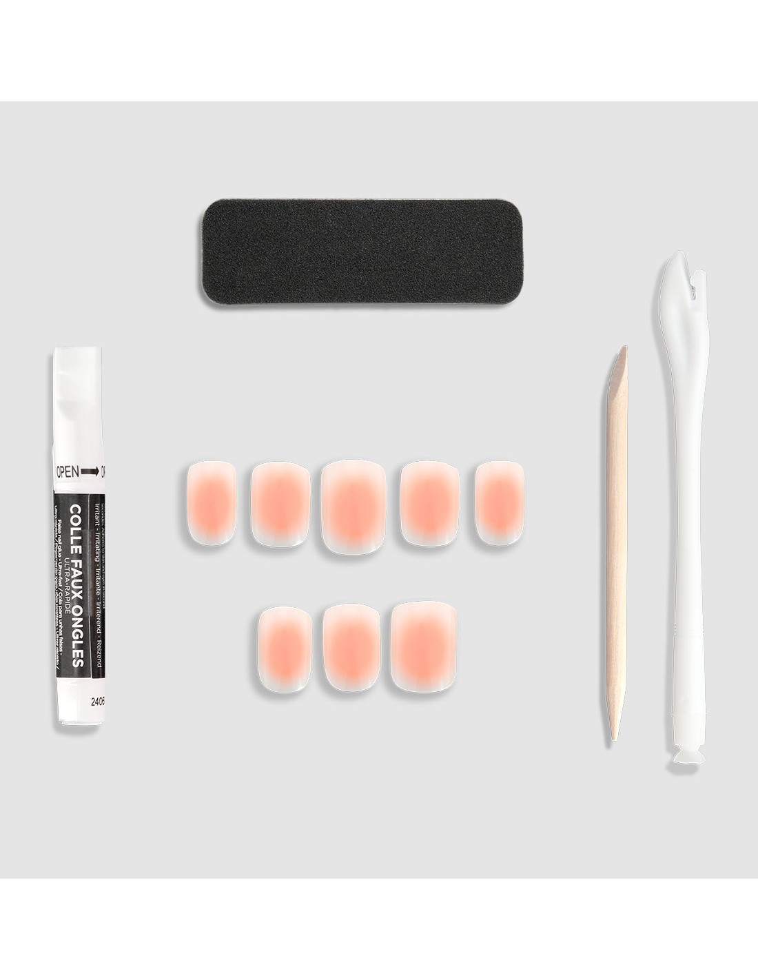 Le kit de faux ongles contient tout ce qu’il vous faut pour une pose facile et soignée : une colle de 2g, une lime à ongles, un bâtonnet repousse-cuticules et un applicateur.