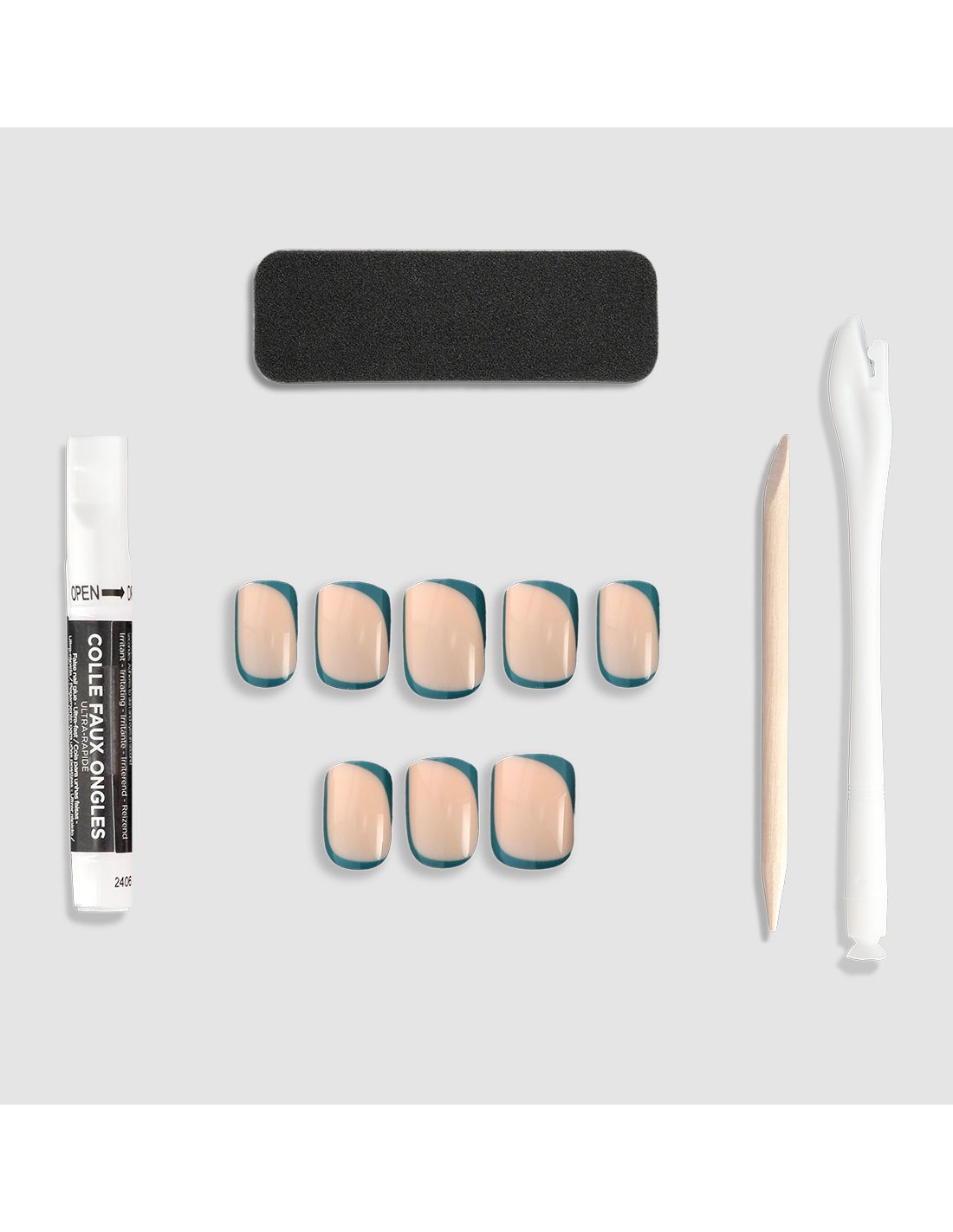 Le kit de faux ongles contient tout ce qu’il vous faut pour une pose facile et soignée : une colle de 2g, une lime à ongles, un bâtonnet repousse cuticules et un applicateur.