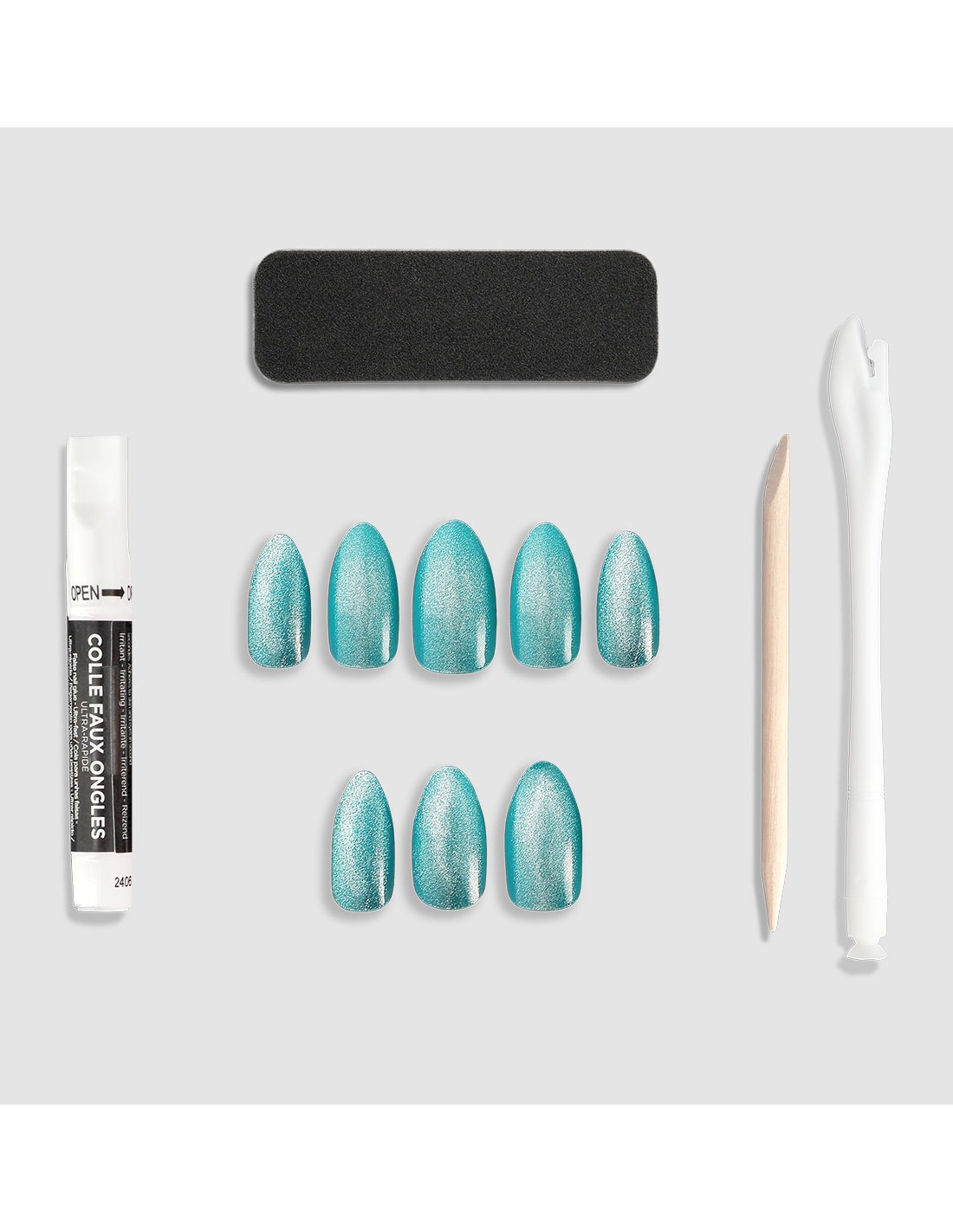 Le kit de faux ongles contient tout ce qu’il vous faut pour une pose facile et soignée : une colle de 2g, une lime à ongles, un bâtonnet repousse cuticules et un applicateur.