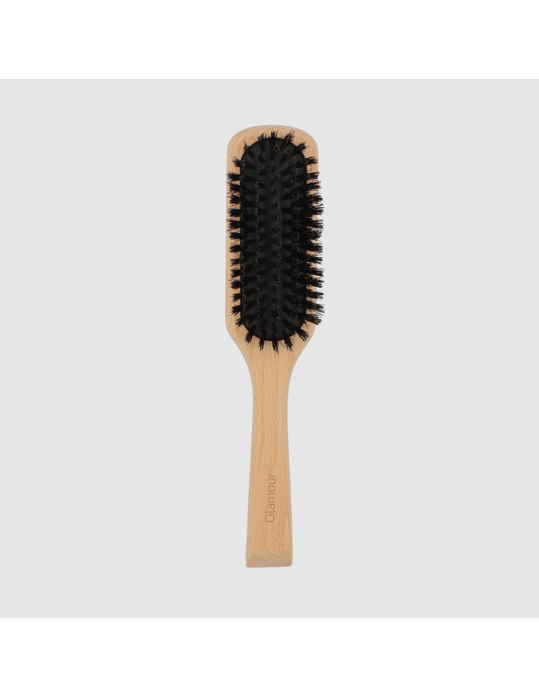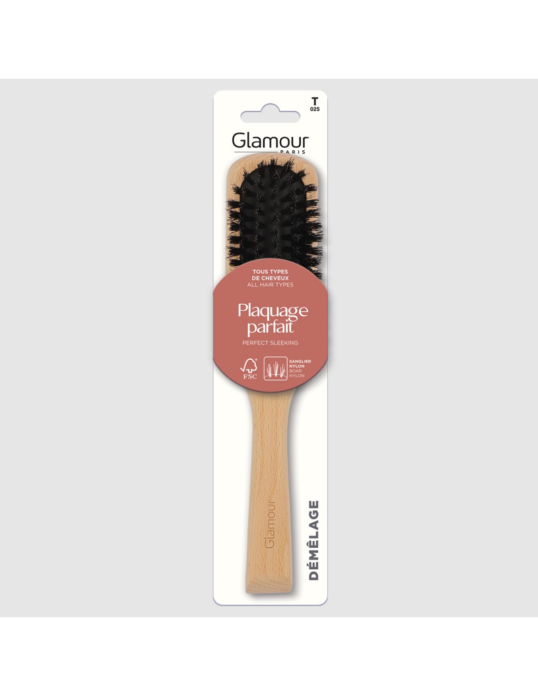 L'alliance des poils de sanglier et du nylon permet de plaquer les cheveux avec efficacité tout en leur apportant brillance et souplesse.