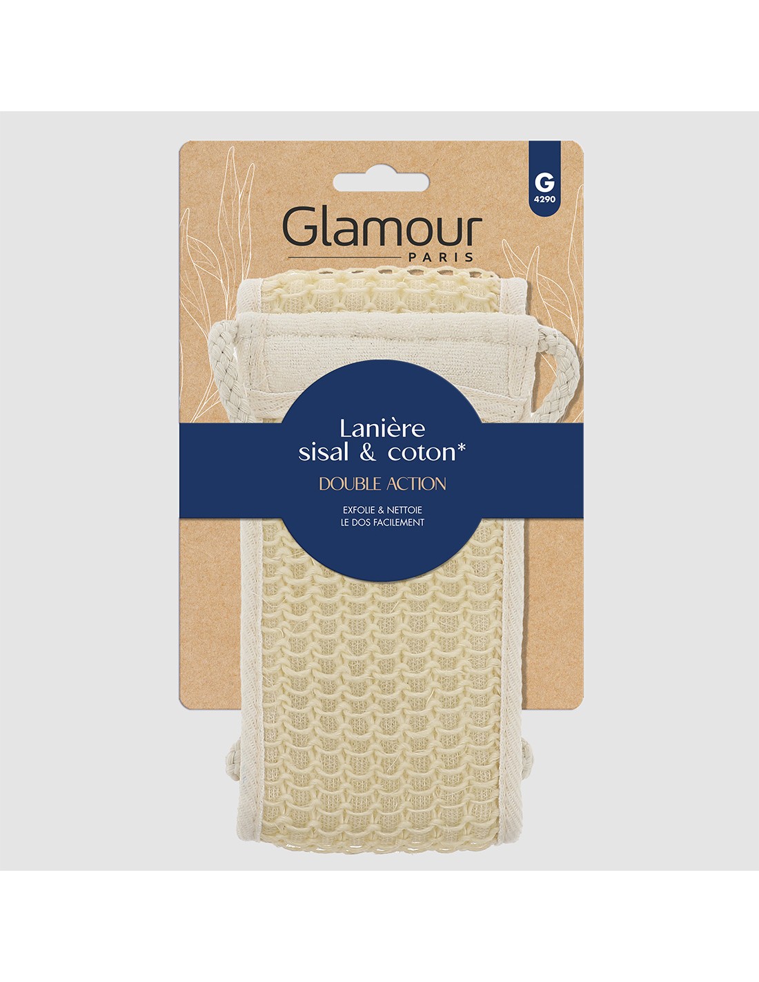 Lanière dos double action, idéale pour exfolier et laver les zones du corps les plus difficiles à atteindre.