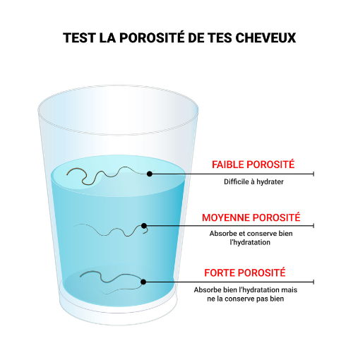 Avant de chercher des solutions radicales, il est important de s'assurer que nous ciblons bien le bon souci capillaire. Pour confirmer la porosité de vos cheveux, on vous propose un test rapide et efficace. Prélevez quelques mèches de cheveux propres et secs de votre tête, sans produits de soin, et placez-les dans un verre d'eau. Revenez quelques minutes plus tard : si les cheveux ont coulé, cela confirme que vous avez bien des cheveux poreux. En effet, les cuticules de vos cheveux sont trop ouvertes et absorbent facilement l'eau. Si les mèches flottent toujours à la surface, la porosité n'est pas le problème à résoudre dans votre cas.